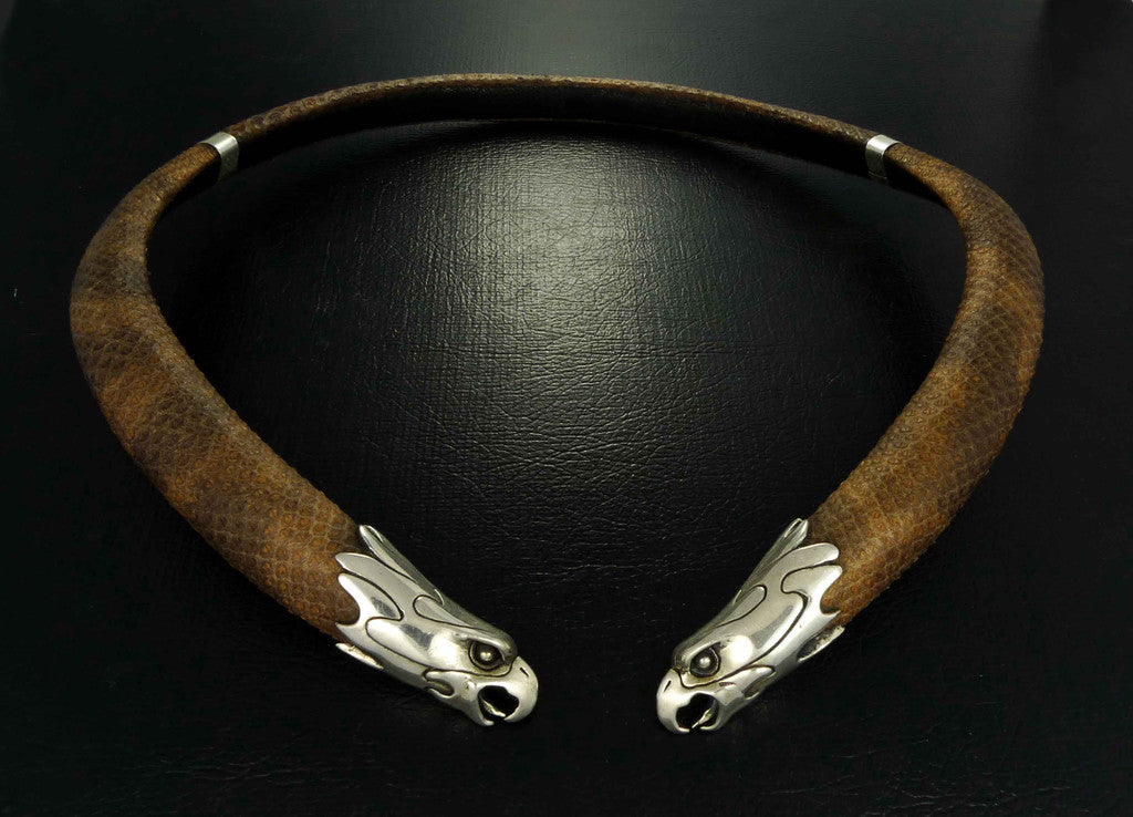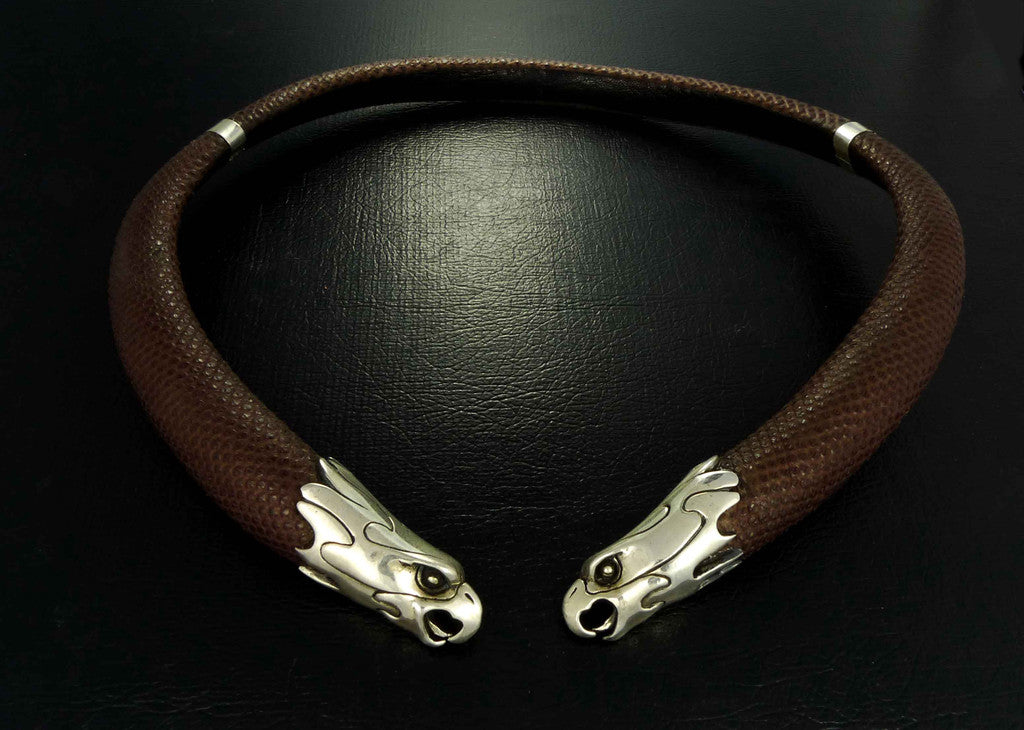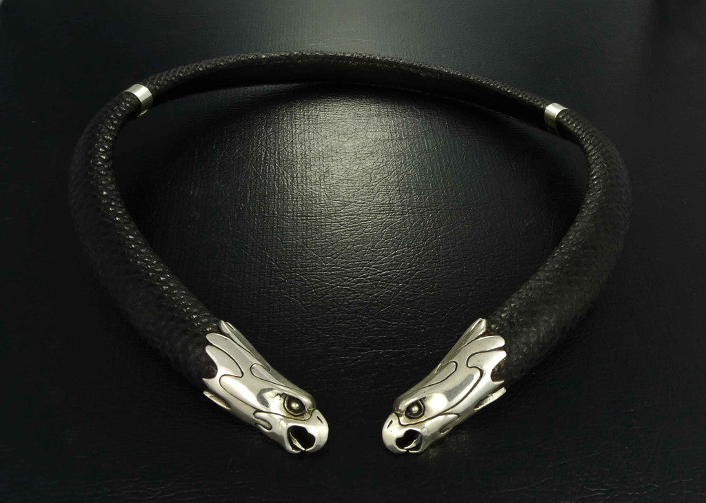 This Eagle necklace is with crafted from natural sting ray leather. It is also available in a variety of other leathers and colours, and optional gemstone accents. It is hand crafted from Sterling Silver and is stamped on the back with the Mercurious name and logo and 925 to guarantee authenticity. Be sure to check out other Mercurious cuffs also offered in the Eagle range.