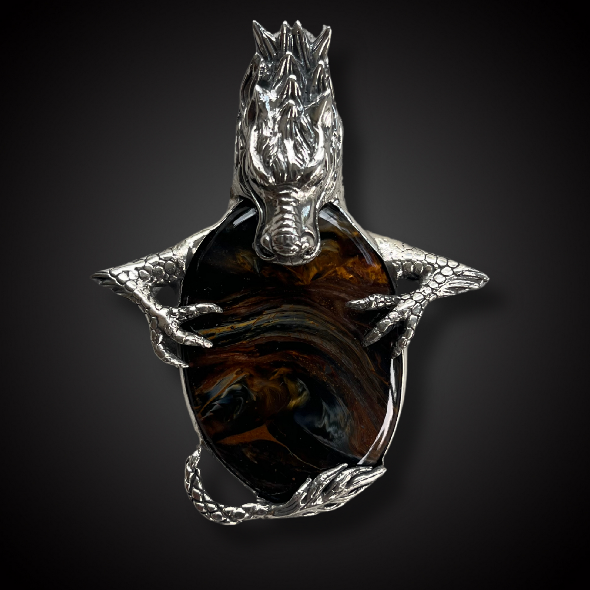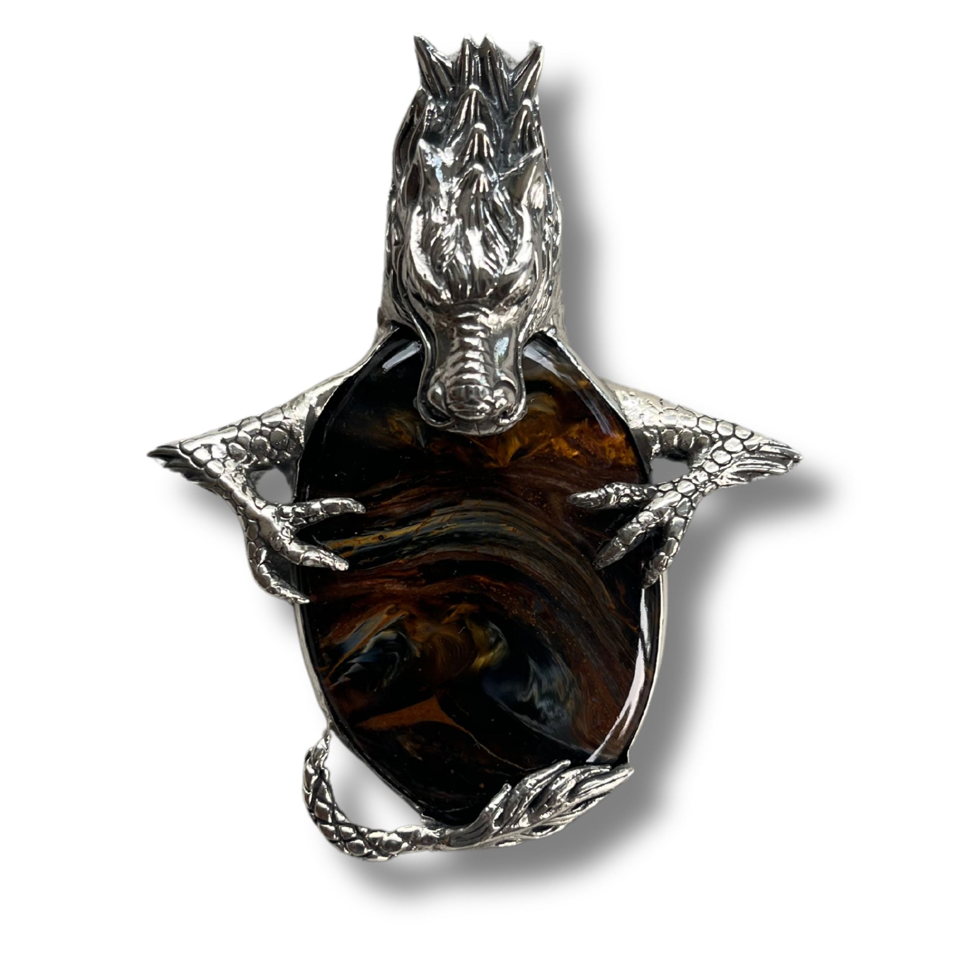 Dragons feature widely in many ancient mythologies around the world (The Chinese, The Celtic and Queztacoatl of the Mayans, for example). Often seen as guardians of sacred mystical treasures, these fire-breathers bridge the space between the Heaven and Earth and so are considered to be a direct connection to celestial or spiritual energies! This monster piece is definitely not shy, and takes some attitude to wear it.