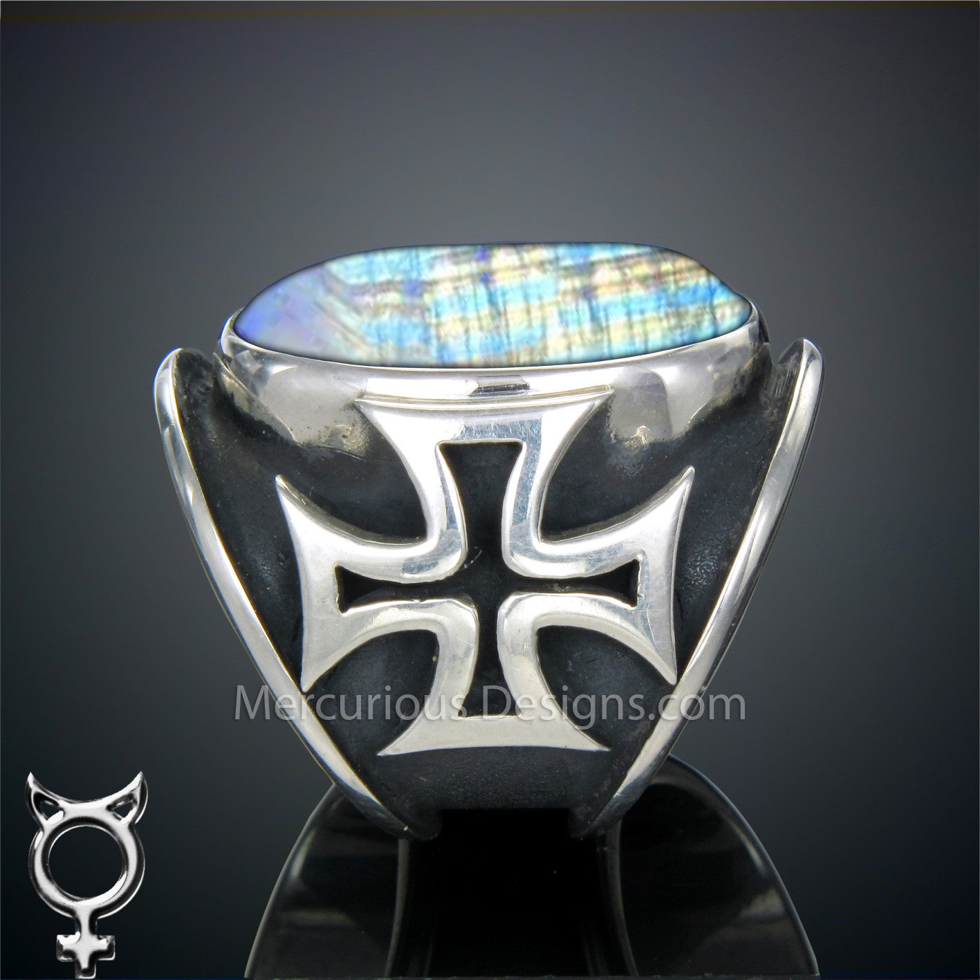 This Maltease Cross ring is a definite power piece. Chunky and direct, echoing with ancient symbology, it makes a very strong, bold statement. Although it is most commonly associated with the modern German military decoration, its design actualy comes from the Maltese Cross, which is a symbol of the Knight Hospitaller, who took care of sick pilgrims to the Holy land a thousand years ago, and who later became a military order during the Crusades. From this origin, the symbol is still widely used all over the world by ambulance and medical groups, as well as, ironically, various military units. It looks much the same as the Iron Cross of the Teutonic Knights, who had a similar medieval history,