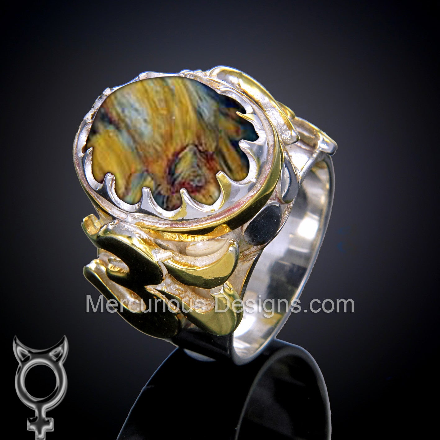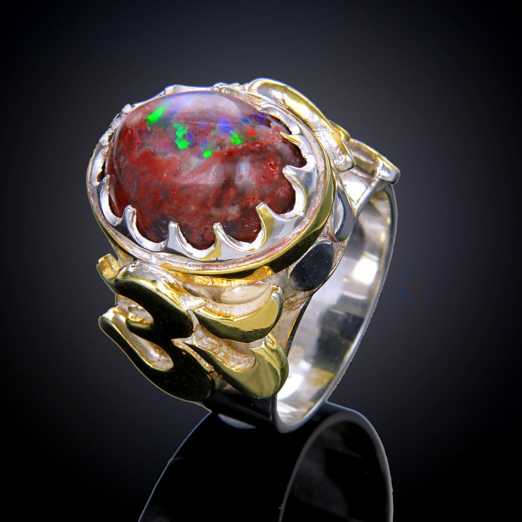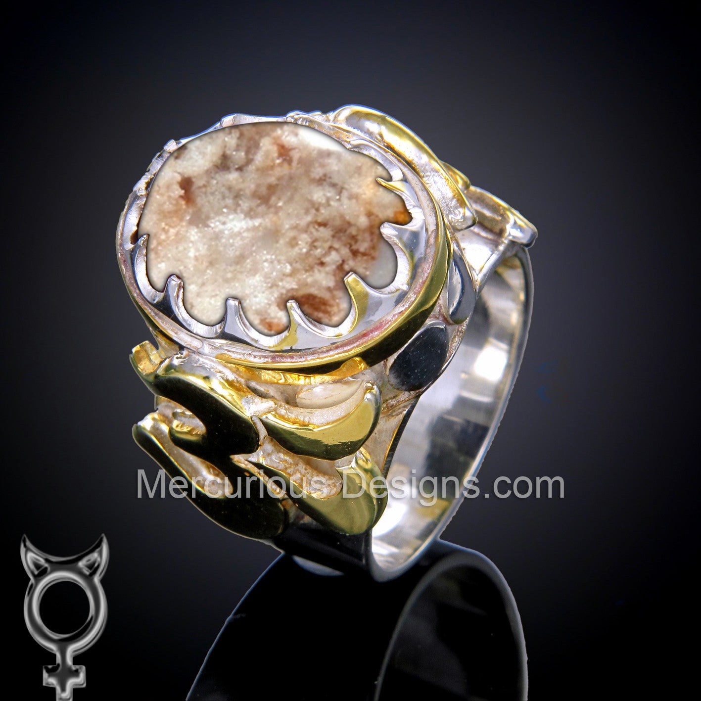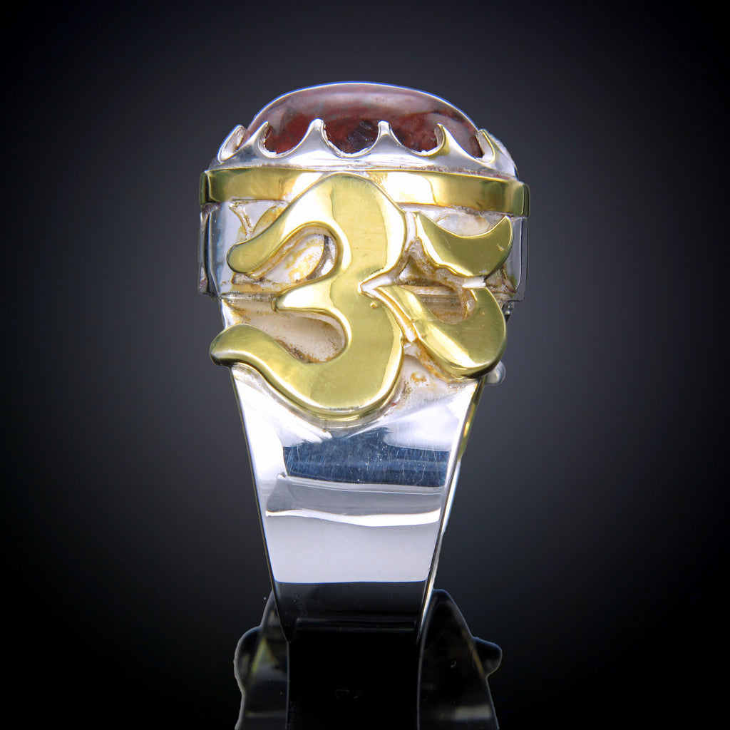 The Om Ring shown here is with a brilliant Fire opal from Mexico, with an 18 Kt gold plated finish. It is also available in a variety of other gemstones, and custom finishes. It is hand crafted from Sterling Silver and is stamped on the back with the Mercurious name and logo and 925 to guarantee authenticity.