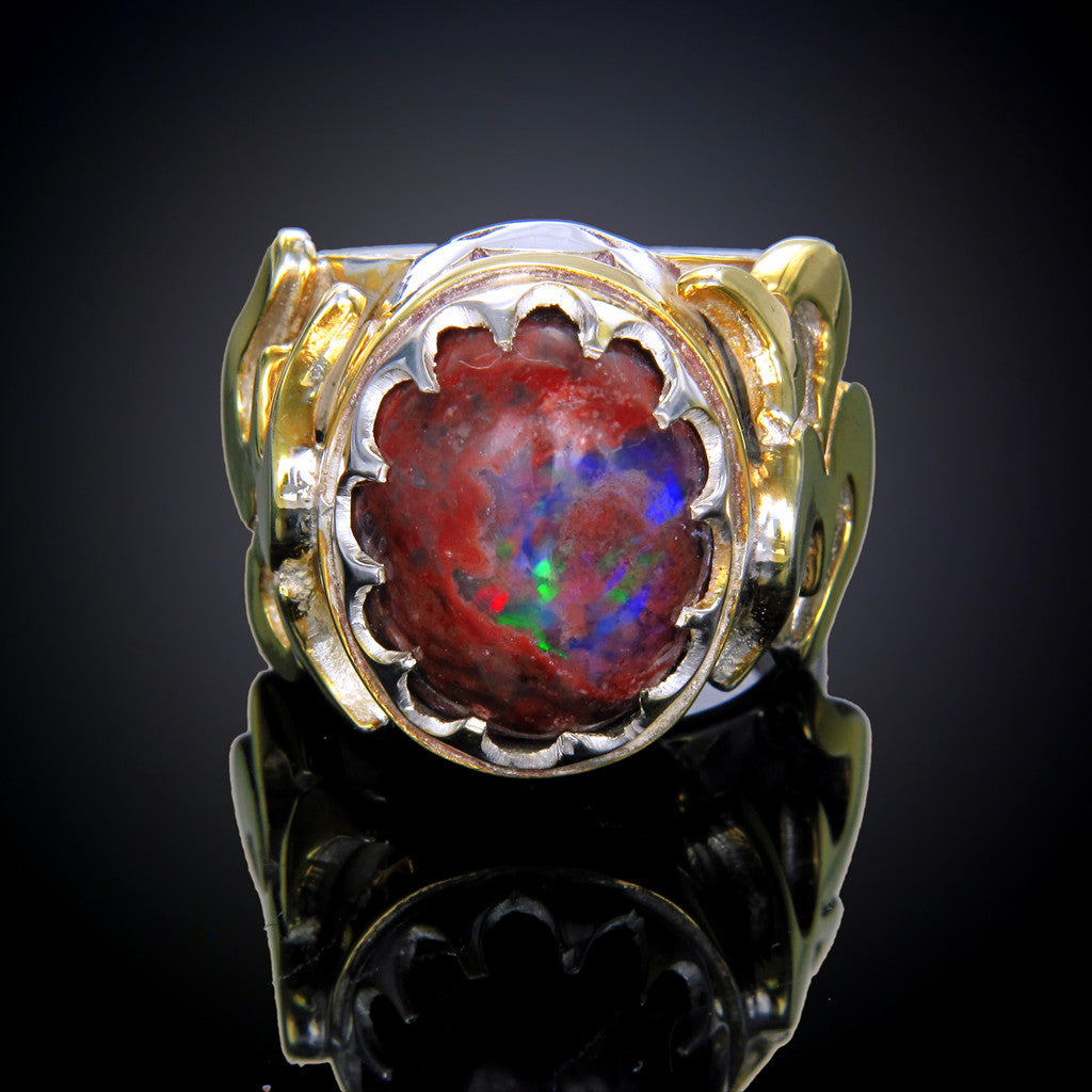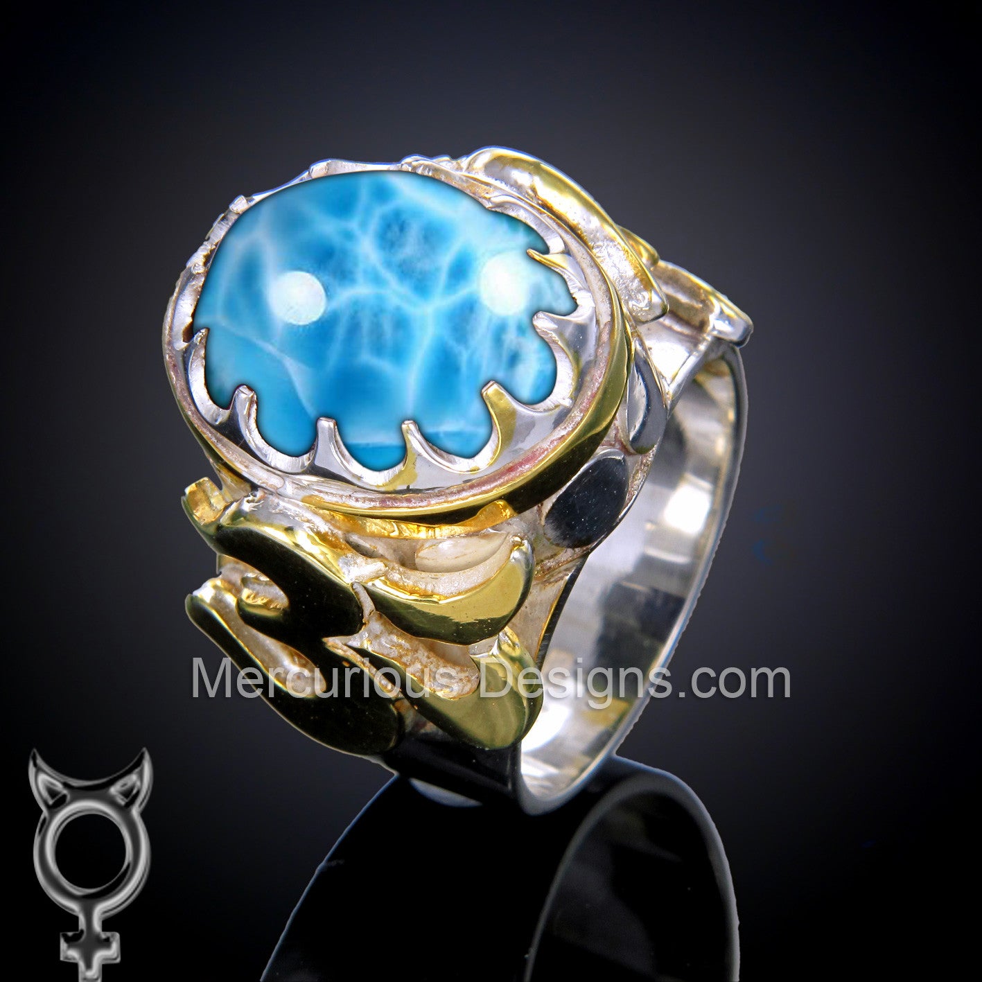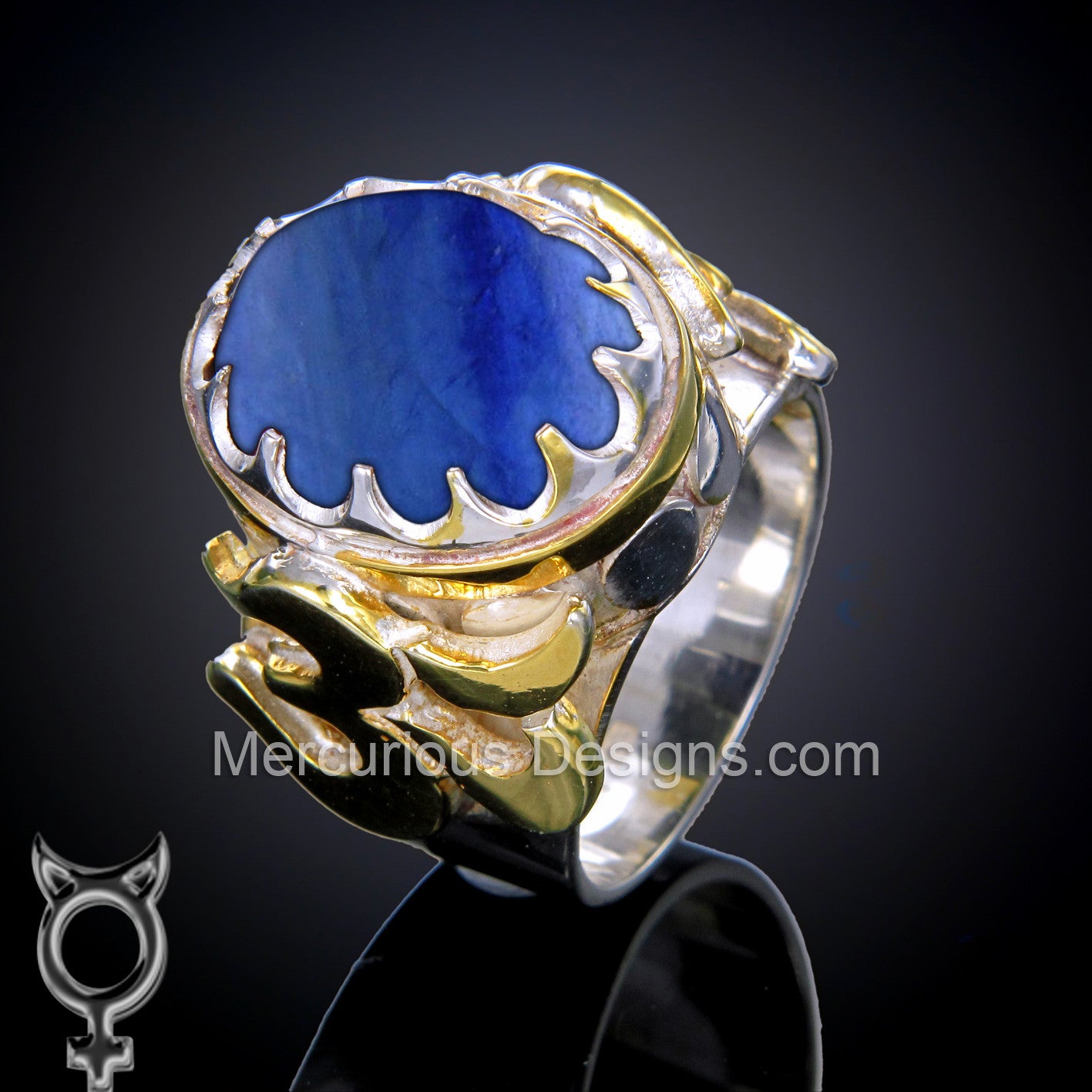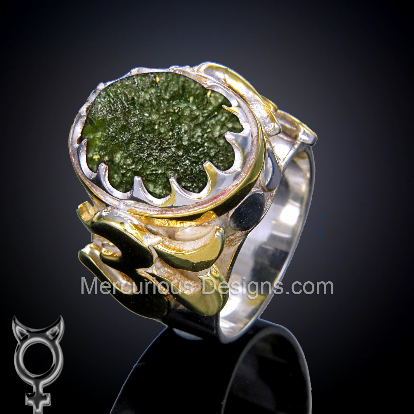 The Om Ring shown here is with a brilliant Fire opal from Mexico, with an 18 Kt gold plated finish. It is also available in a variety of other gemstones, and custom finishes. It is hand crafted from Sterling Silver and is stamped on the back with the Mercurious name and logo and 925 to guarantee authenticity.