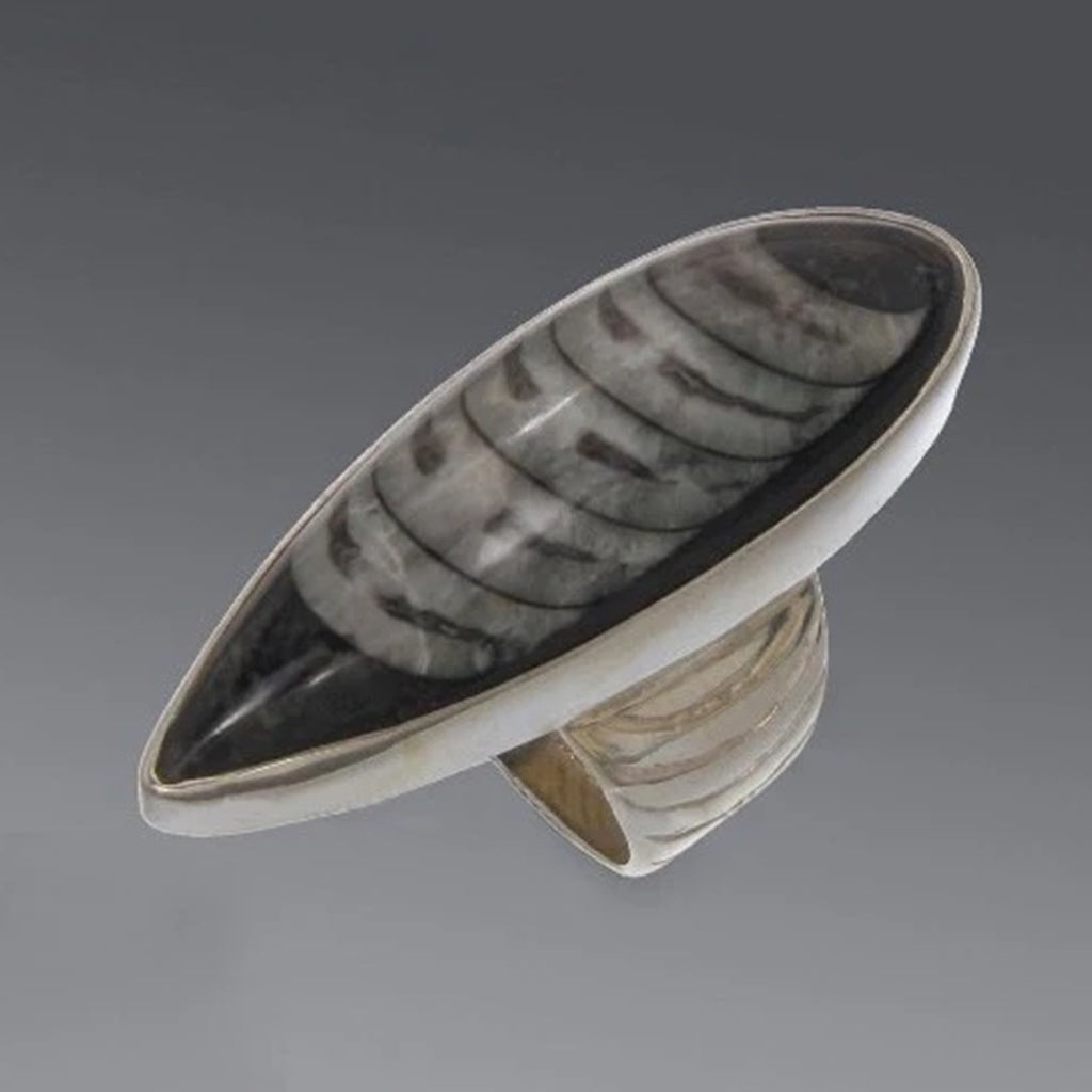 The Orthocerus is an ancient fossil, from the nautiloid cephalopod family, that lived in a straight shell, rather than a spiral like the ammonites. They often have markings that resemble a face or a tribal shield. So this ring represents endurance (through time) and Protection (as a Shield).