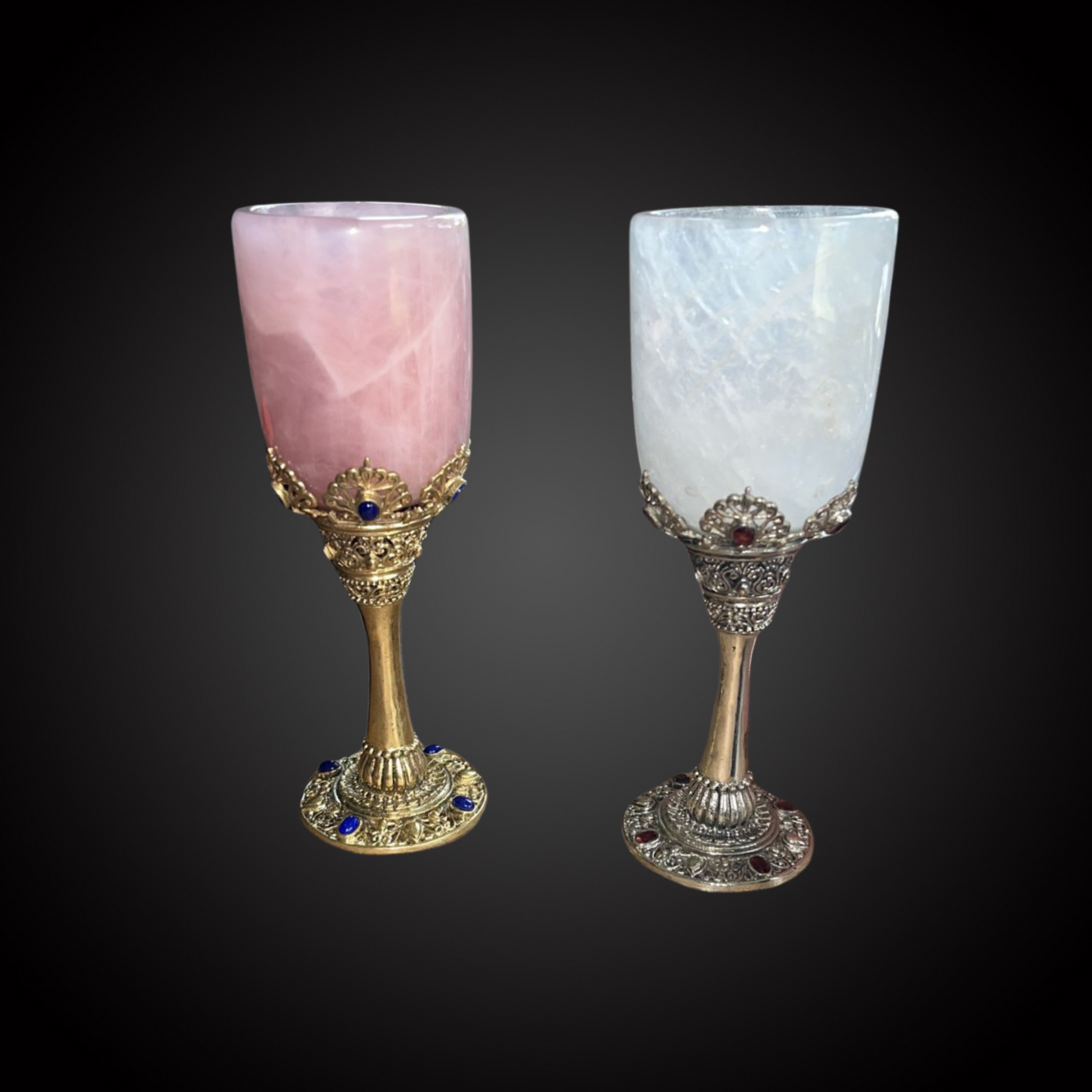 A new ritual chalice offered in a variety of semi precious gemstone bowls ...rose quartz, clear quartz, rainbow fluorite....and different finishes, bejewelled with small faceted gemstone accents