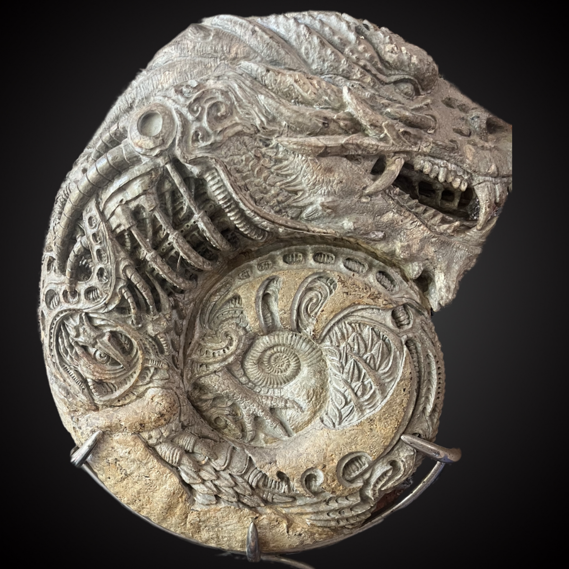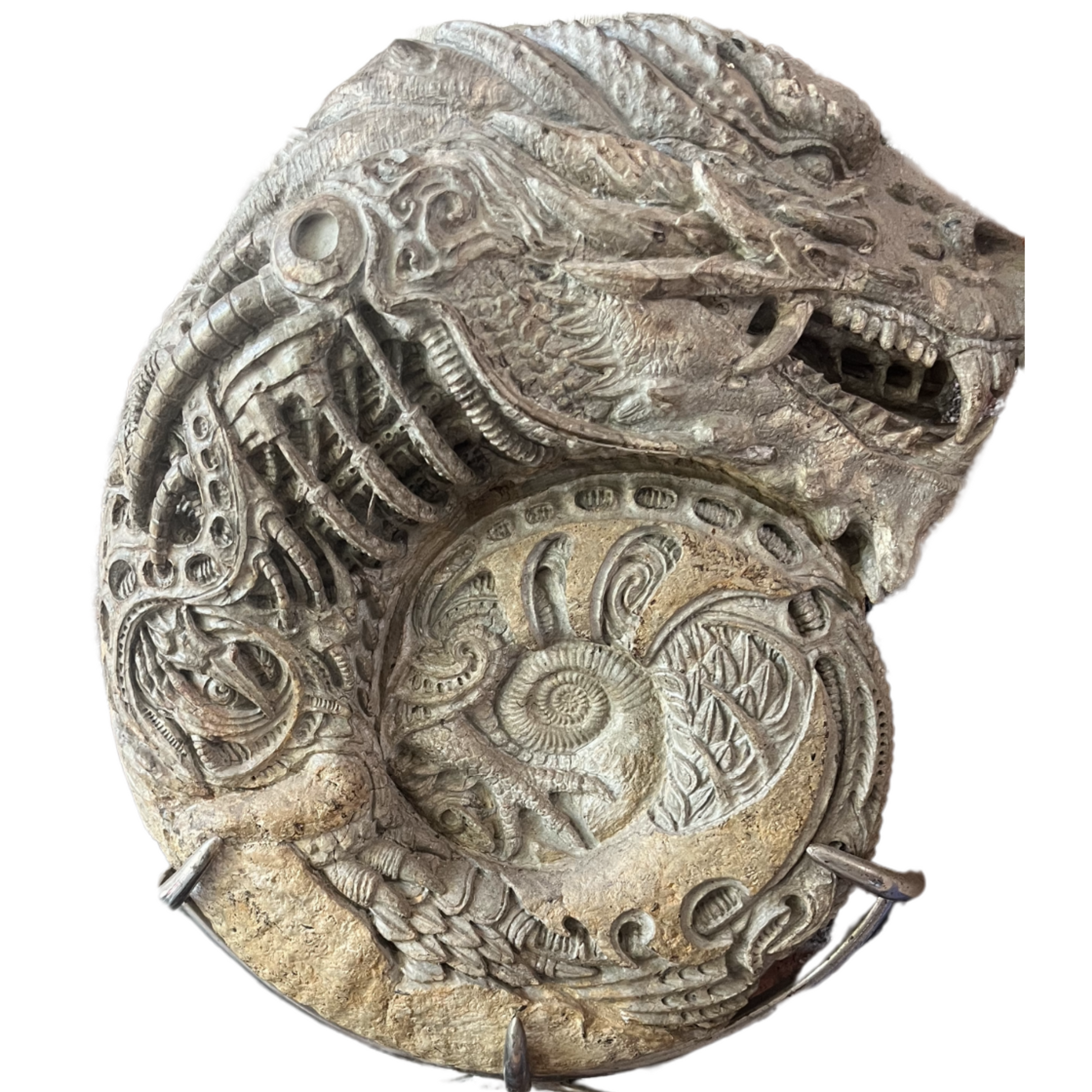 This is the absolute cream of my collection. Carved from a giant Moroccan ammonite with bio-mechanical details weighing approx 35 kgs and is 55 cms (2’) across.