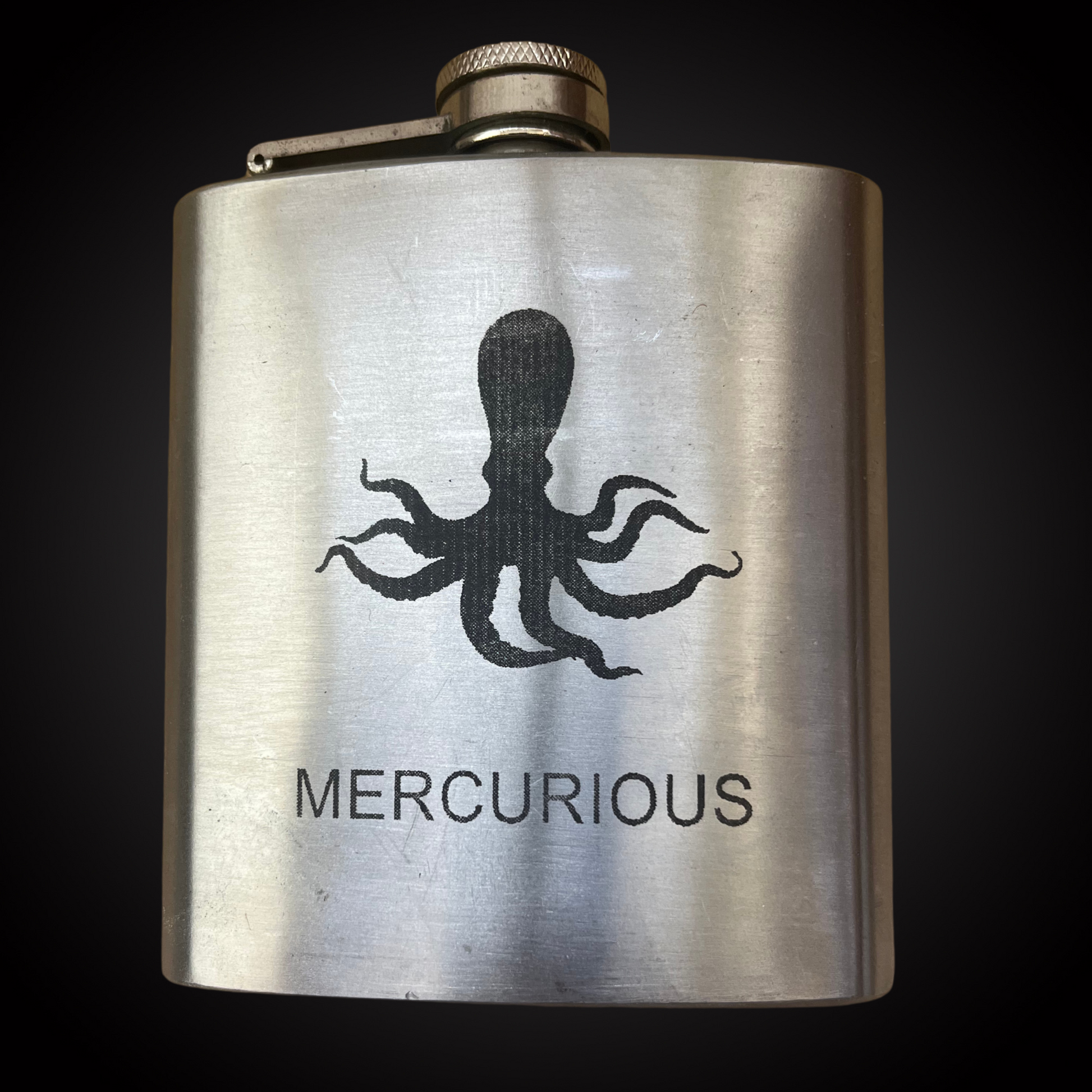 Stainless steel 6 oz hip flask emblazoned with the Mercurious name and our favourite animal totem