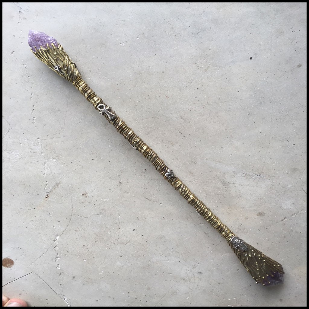 This is one of our shorter Magic Wands, but she is totally loaded. She is 35 cms long (14"") tipped with Polished Rose Quartz and rough Kunzite, accented with Moldavite, faceted Libyan desert glass, faceted rose quartz, labradorite and a flashy Mexican fire opal, and emblazoned with Sterling Silver symbols; the Ankh, Pentagram, Hamsa and Eye of Horus. Textured in Brass with circular tentacular motifs.