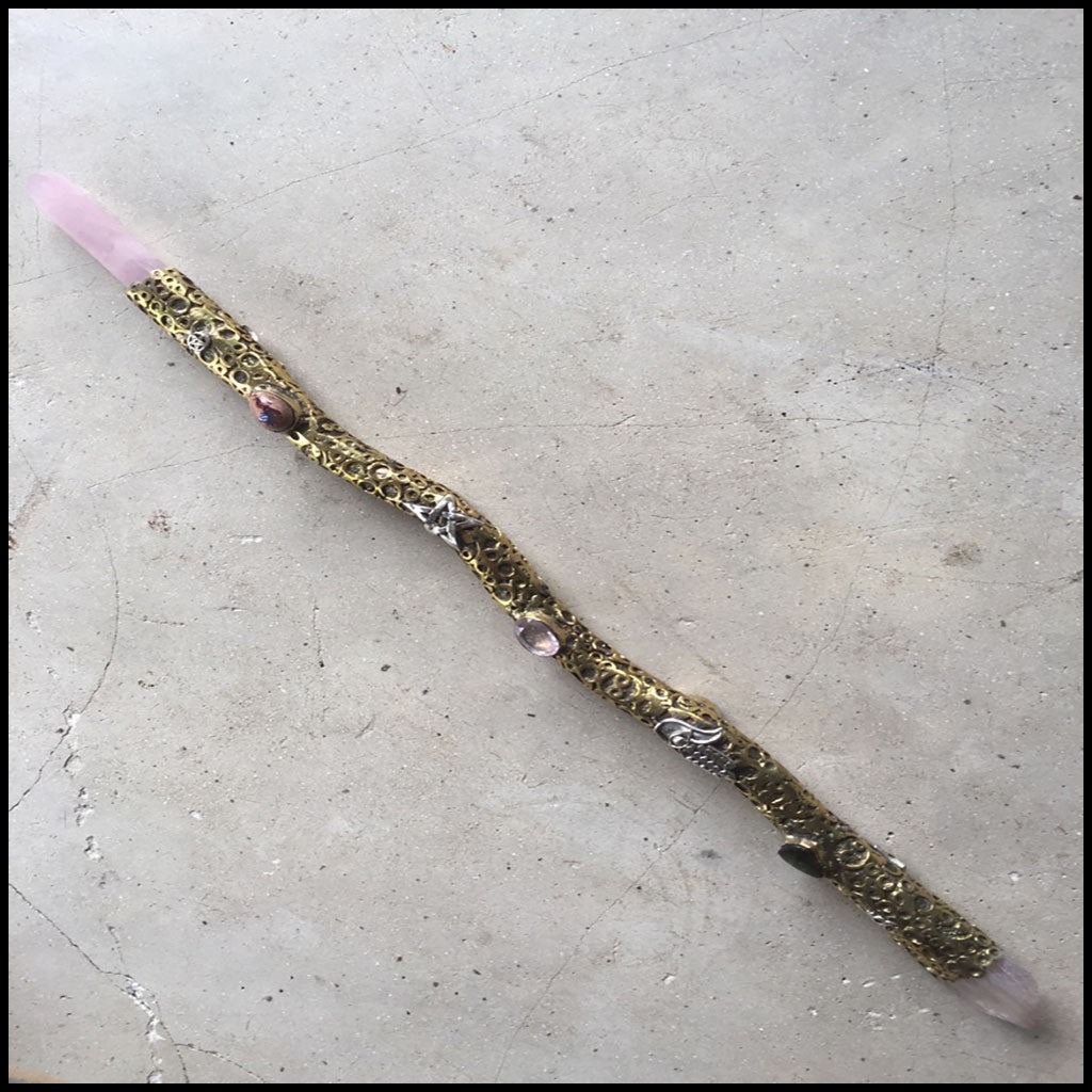 This is one of our shorter Magic Wands, but she is totally loaded. She is 35 cms long (14"") tipped with Polished Rose Quartz and rough Kunzite, accented with Moldavite, faceted Libyan desert glass, faceted rose quartz, labradorite and a flashy Mexican fire opal, and emblazoned with Sterling Silver symbols; the Ankh, Pentagram, Hamsa and Eye of Horus. Textured in Brass with circular tentacular motifs.