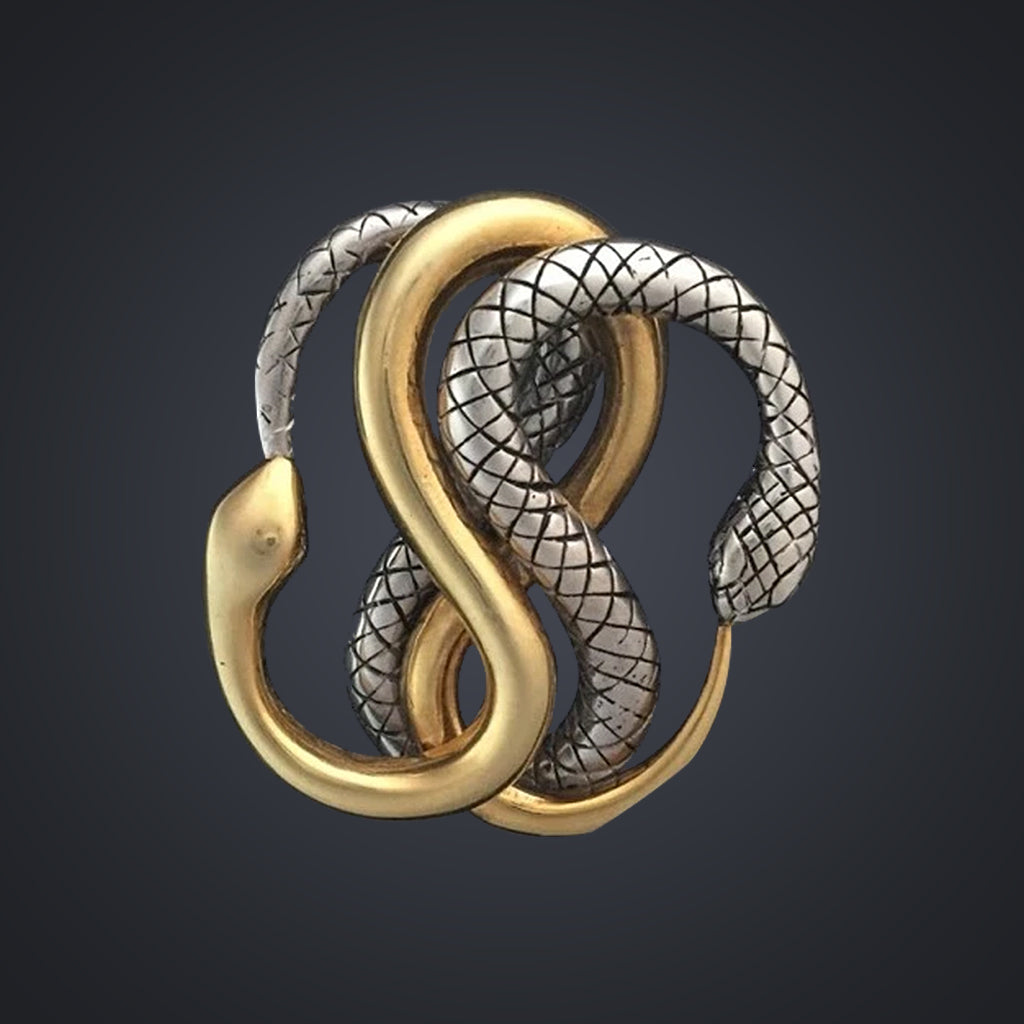 Intertwined snakes are a really old symbol dating back to Sumerian times (5,000+ years) and are found eating their own tails in ancient Egyptian glyphs and a whole variety of religious, esoteric and alchemic texts since then. This represents self-renewal and Eternity. In this slightly more complex design, two snakes are seen eating each others tails in an endless Infinity knot. We originally designed this piece to come apart as a clasp, but now offer it joined into a single pendant, one textured in sterling silver, and the other in a textured gold plated brass.