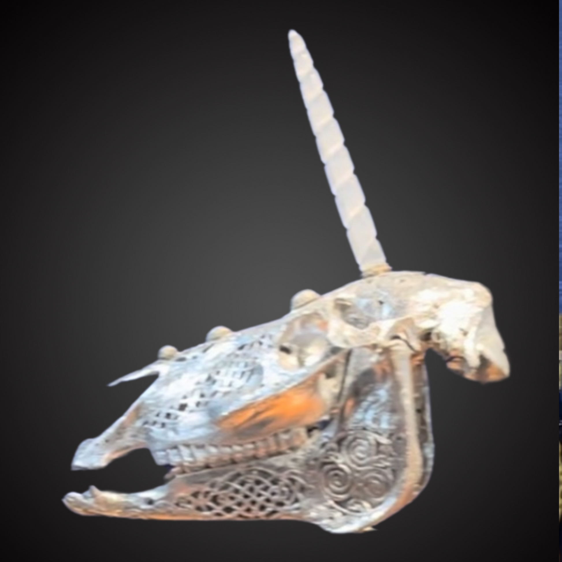 Hand carved with a traditional Celtic knotwork design, adorned with Rainbow Moonstone accents and a spiral selenite horn… silver-leafed and mounted on a stainless steel stand.